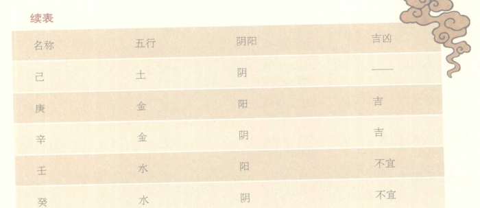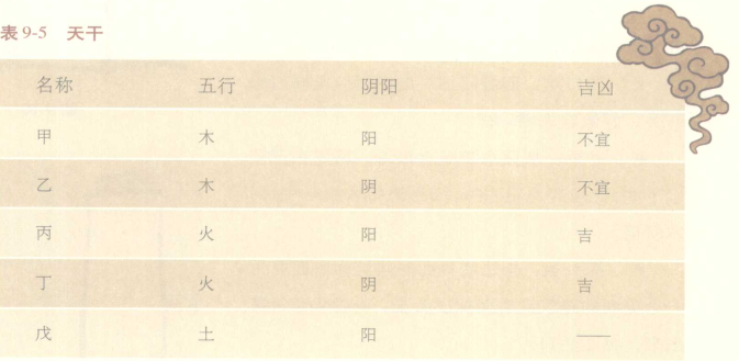 天干和地支是构成计量时空基础的组合,根据对应的卦的阴阳平衡,天干有吉利或不吉利的说法(见表9-5)。