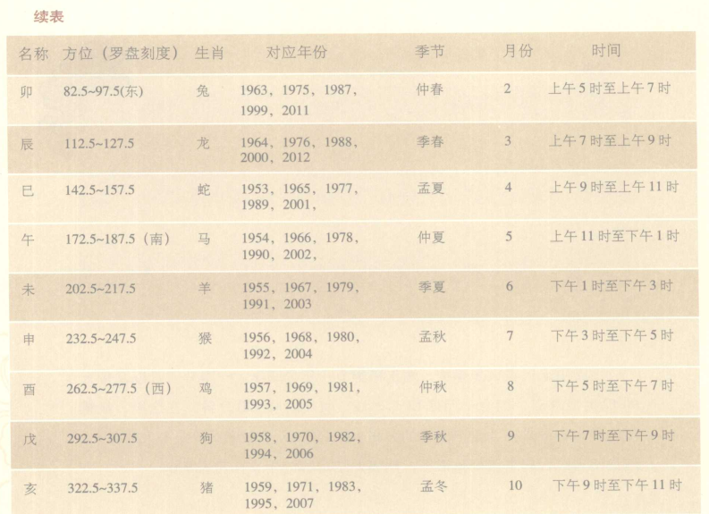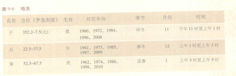 地支用来代表很多事物,与季节一年分为四季,每季又分为三个月和每天的12个时辰相对应。一天有12个时辰,每个时辰为120分钟。地支在罗盘方向上的分布是十分重要的(见表9-6)。